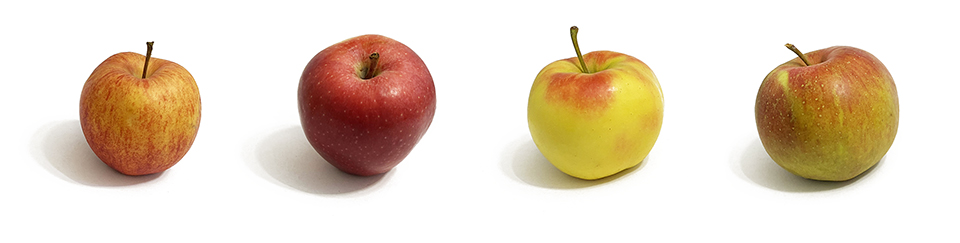 v. l. n. r. Minister von Roderheim, Larifa, Gelber Rosenapfel, Dünner Pfannkuchenapfel